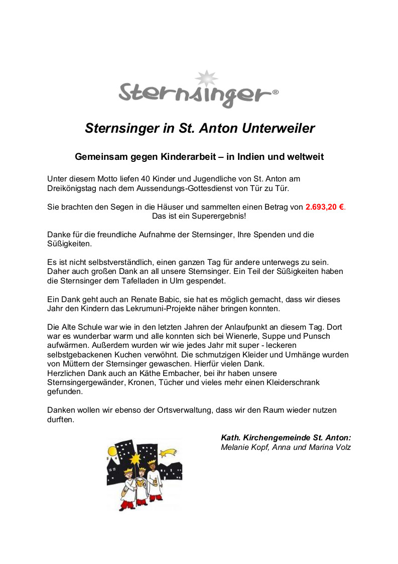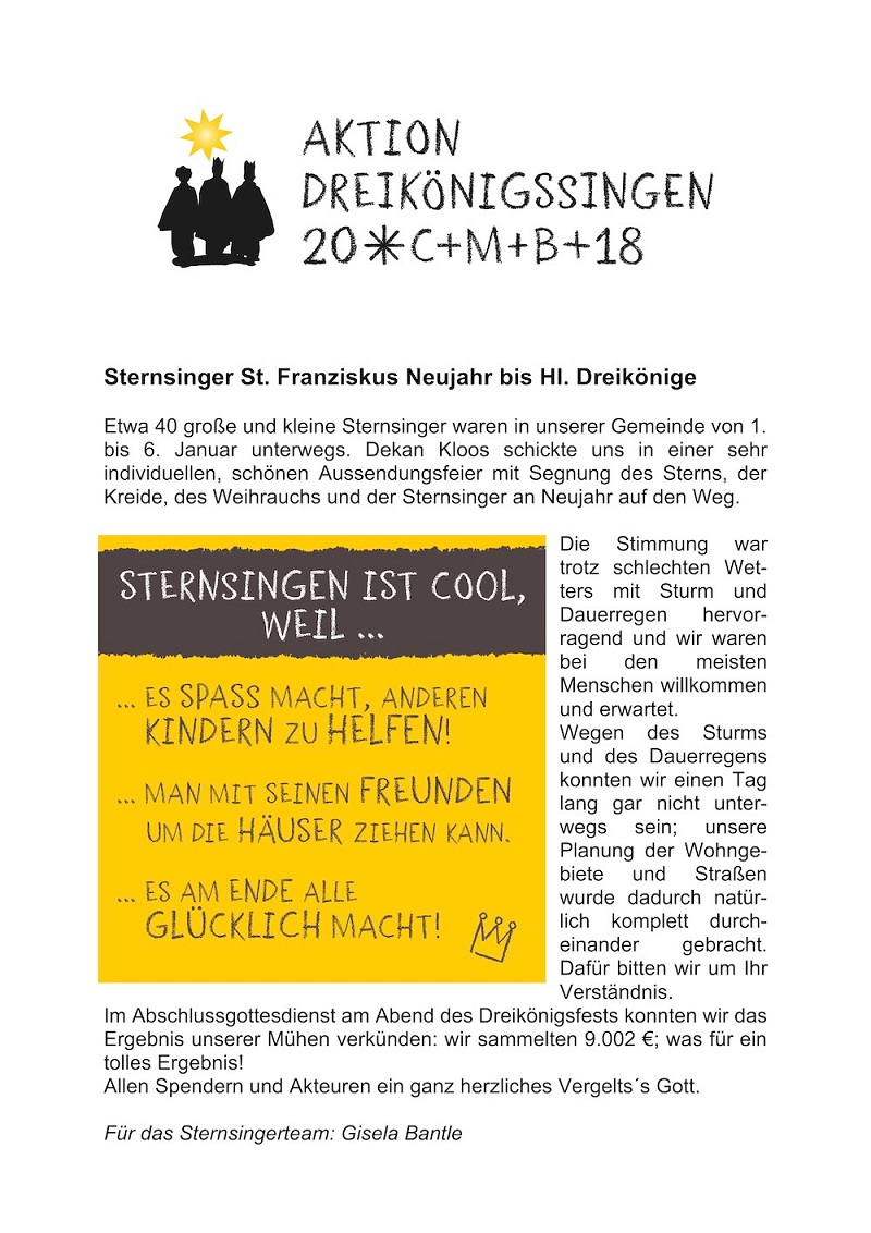 Verfolgen Sie nun die einzelnen Berichte und Bilder unserer Sternsingerteams in den jeweiligen Gemeinden. Viel Spaß dabei.