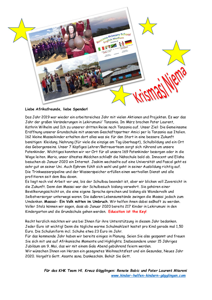 Bereits zum 14. Mal veranstaltete das KHK Team Hl. Kreuz Gögglingen am 15. Dezember 2019 ein Benefizkonzert im Christophorushaus in Gögglingen. Kinder und Jugendliche Solisten aus den beiden Gemeinden Gögglingen und Donaustetten, der Junge Chor unter Leitung von Simon Kaifel, Herr Kelsch mit seinen Flöten/Gitarrenkindern sowie Herr Antonic mit seinem Kinderorchester des Akkordeonsspielrings Erbach bescherten dem Publikum einen schönen 3. Adventsnachmittag. Ein besonderes Highlight war die musikalische Einlage von Vikar Michael Schönball (Cello) und Simon Kaifel (Klavier). In der Pause gab es Punsch und Gebäck, sowie eine große Weihnachtstombola. Der Erlös der Veranstaltung in Höhe von 3687 Euro war für das Projekt „Eine Schule für die Massai in Lekirumuni/Tanzania bestimmt. Sogleich wurde dort vor Ort mit dem Weiterbau der Grundschule begonnen. So wächst unsere Schule Stück für Stück. Und nach 1,5 Jahren ist der Bau bereits soweit fortgeschritten, dass dort 204 Massaikinder eine nie dagewesen Chance auf eine bessere Zukunft erhalten. Wir machen uns stark für Kinder in Lekirumuni.
