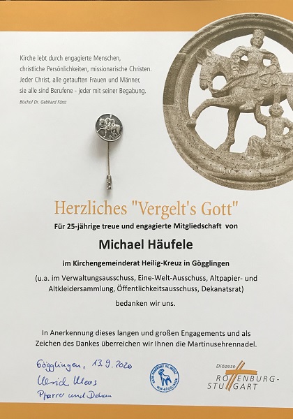 In Anerkennung dieses langen und großen Engagements und als Zeichen des Dankes überreichte Dekan Ulrich Kloos am Sonntag, dem 13.9.2020 Michael Häufele die Martinusehrennadel der Diözese Rottenburg – Stuttgart.