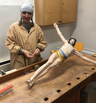 Kamila Markow restaurierte mit viel Einsatz und Liebe die Christusfigur. Die Schreinerei Missler war dafür verantwortlich dem Kern des Kreuzes mit aufgeleimtem Holz wieder ein ansehnliches Äusseres zu verleihen. Johannes Schöllkopf hat sich danach mit Hingabe um die Ausarbeitung der Feinheiten gekümmert. So wurden die von Josef Kaifler ausgewählten Symbole (Kelch mit Hostie, Speer und Lanze mit Schwamm, und 3 Würfel) von J. Schöllkopf in das Kreuz kunstvoll eingefräst.