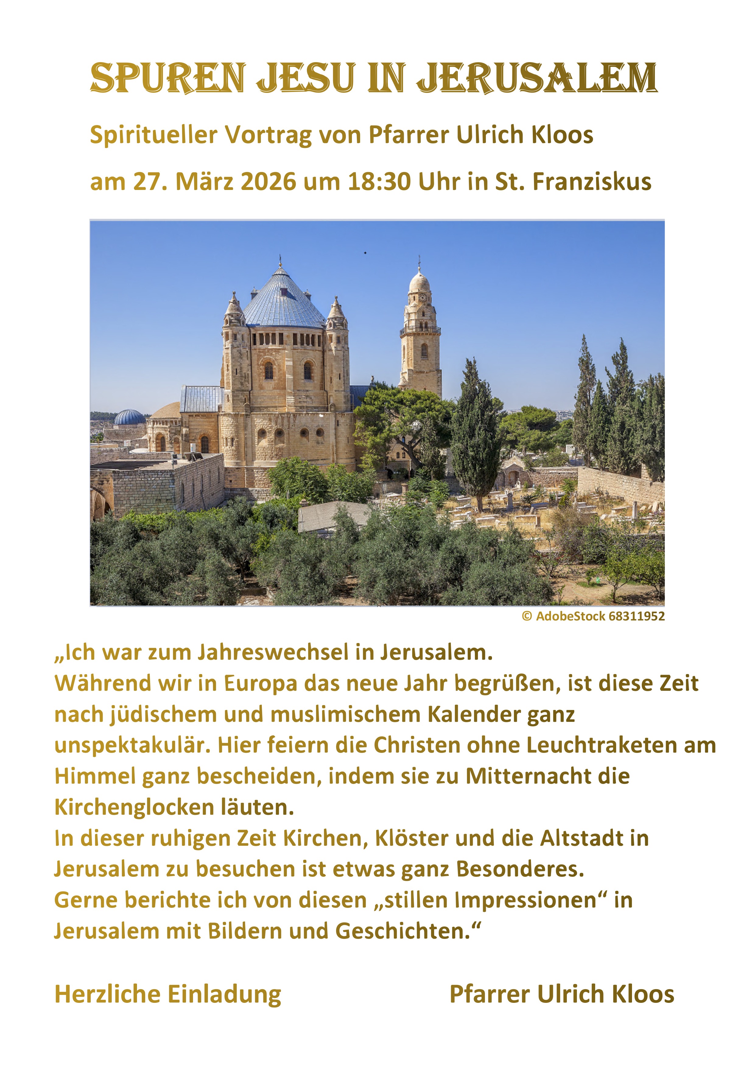 27. März 2026, 18:30 Uhr in St. Franziskus am Tannenplatz: Vortrag “Spuren Jesu in Jerusalem” von Pfarrer Kloos
