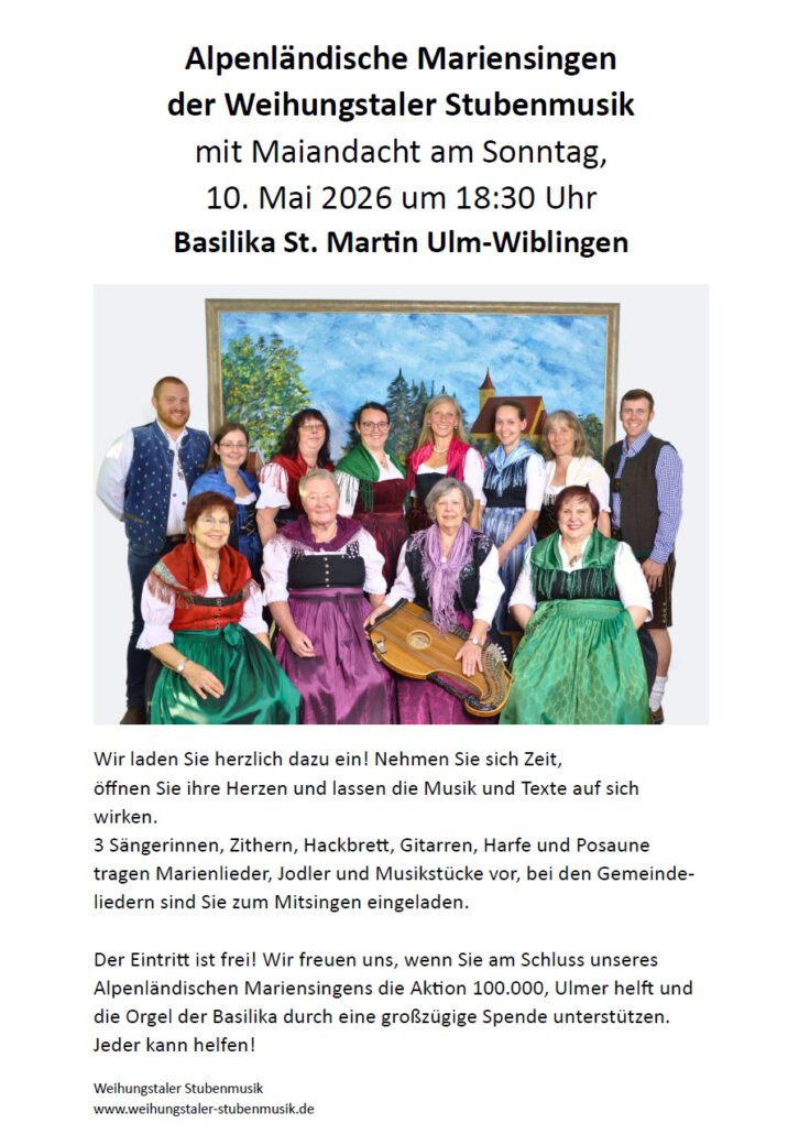https://www.ulm-basilika.de/wp-content/uploads/2025/04/maiandacht-mit-weihungstaler-stubenmusik-18-05-2025-bild.jpg485689Gabi Laibhttp://www.ulm-basilika.de/wp-content/uploads/2013/04/ulm-basilika-wibilingen-logo2.pngGabi Laib2026-04-29 07:53:422026-04-29 08:04:38Alpenländisches Mariensingen der Weihungstaler Stubenmusik mit Maiandacht am Sonntag, 10.05.2026 um 18:30 Uhr in der Basilika St. Martin, Ulm-Wiblingen