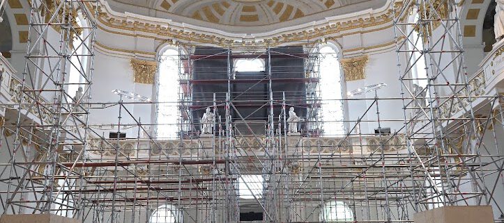 Nach dem Heilig-Kreuz-Fest in Wiblingen, also ab dem 15. September begann die nächste Bauphase in der Wiblinger Basilika. Das Gerüst im Chorraum wird abgebaut und das Gerüst im Langhaus aufgebaut. Die Arbeiten beginnen mit dem Schutz der Hauptorgel, die aber für die Sonntagsgottesdienst spielbar bleibt, und dem Aufbau des Gerüsts im Langhaus. Ein Tunnel macht den Zugang nach vorne möglich.