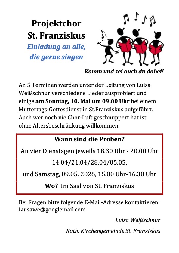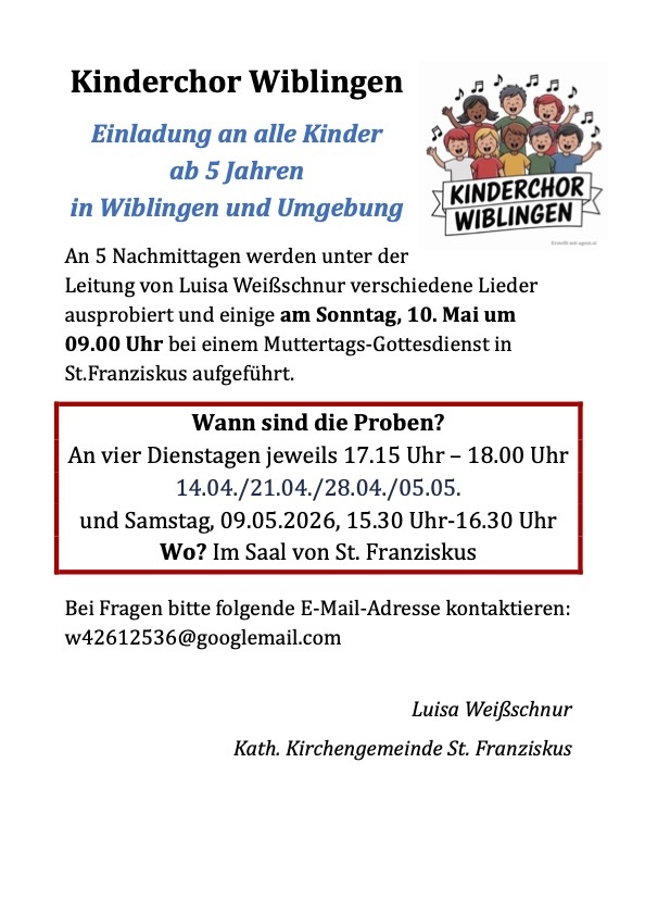 Einladung zum Kinderchor, Chorstunden sind dienstags ab 14. April bis 9. Mai in St. Franziskus