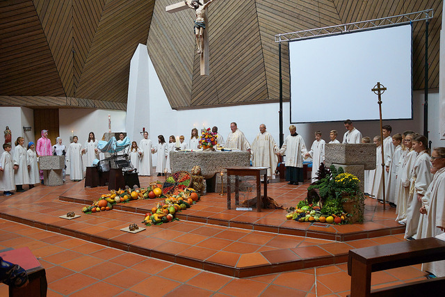 Der Jugendgottesdienst setzte sich kritisch mit der Herstellung von landwirtschaftlichen Produkten und der Haltung von Tieren auseinander. Als Verbraucher muss man sich bewusst werden, dass das eigene Kaufverhalten die Bedingungen für die Produktion von Essen positiv und negativ beeinflussen kann. Im Altarraum war viel los: drei Zelebranten, ein Pastoralreferent und eine Schar Ministranten gestalteten den Gottesdienst. Der A-Capella-Chor des Albert-Einstein-Gymnasiums Wiblingen setzte musikalische Höhepunkte und er darf gerne wieder kommen.
