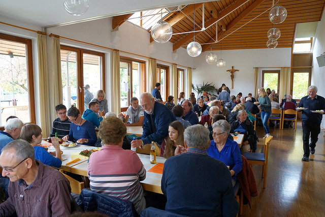 Nach dem Gottesdienst saßen die Besucher gesellig beim Mittagessen beieinander, Kaffee und die selbstgebackenen Kuchen wurden vor Ort oder zum Mitnehmen daheim genossen. Die Kinder und Jugendlichen vergnügten sich beim Basteln, Schminken oder, nachdem sich die Herbstsonne wieder rausgetraut hatte, beim Bogenschießen.