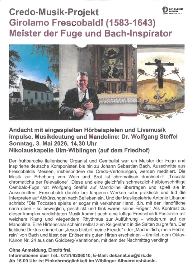 Herzliche Einladung zur Andacht zum Credo-Musik-Projekt – Girolamo Frescobaldi – Meister der Fuge und Bach-Inspirator – am Sonntag, 03. Mai 2026 um 14:30 Uhr in der Nikolauskapelle, Wiblingen