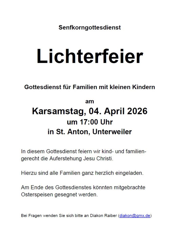 Herzliche Einladung zur Lichterfeier – ein Gottesdienst für Familien mit kleinen Kindern – am Karsamstag, 04. April um 17 Uhr in St. Anton, Ulm-Unterweiler