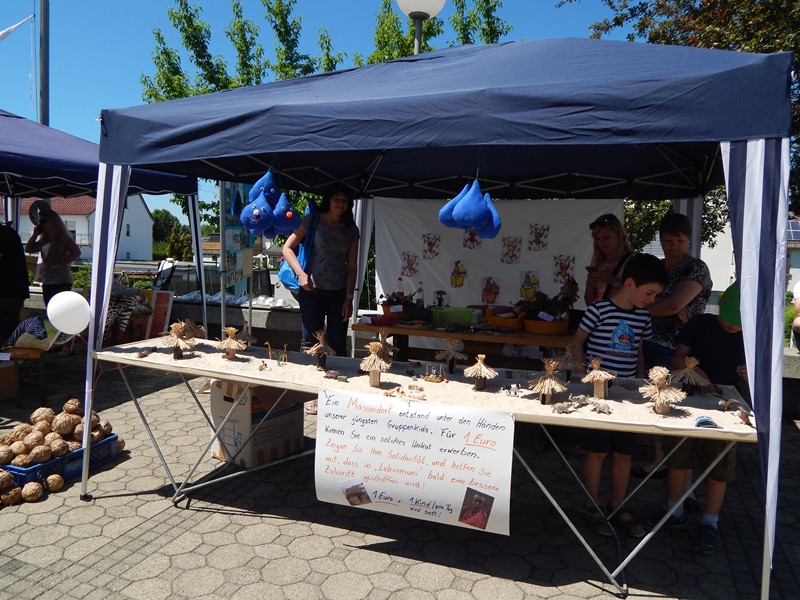 Von 13 – 16 Uhr herrschte buntes Markttreiben auf dem Platz vor der Kirche zur Heiligen Familie in Donaustetten. Unter anderem gab es Afrikanische Köstlichkeiten und Kostbarkeiten aus Tanzania, die Renate Babic und Pater Laurent von ihrer Reise aus Tanzania mitgebracht hatten. Kaffee, Tee, Massaischmuck, Taschen aus einer Näherei in Moshi , Stoffe oder Kultgegenstände,… Es gab einfach alles.  Aber auch unsere Jugendgruppenkids hatten eifrig mit ihren Gruppenleiterinnen gebastelt und so manche Afrikanischen Unikate kreiert die sich wirklich sehen lassen konnten. Die kleinsten, also 1. Und 2. Klässler hatten ein Massaidorf gebastelt und ihre Bomas (das sind die Massai Rundhütten) gegen eine Spende von 1 Euro angeboten.